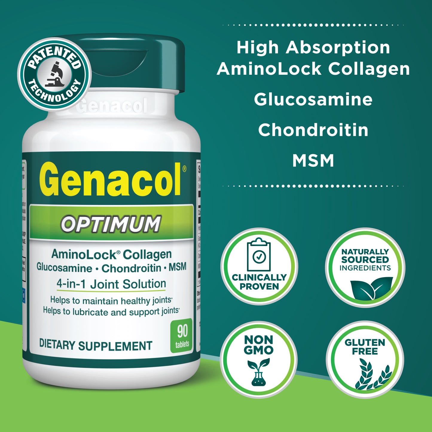 Precio regular $29.99¡Genacol Optimum es la solución 4 en 1 para sus articulaciones! Esta completa y exclusiva fórmula contiene Colágeno AminoLock ultrahidrolizado, glucosamina, condroitina y MSM, 4 ingredientes esenciales para mantener la salud de las articulaciones.
